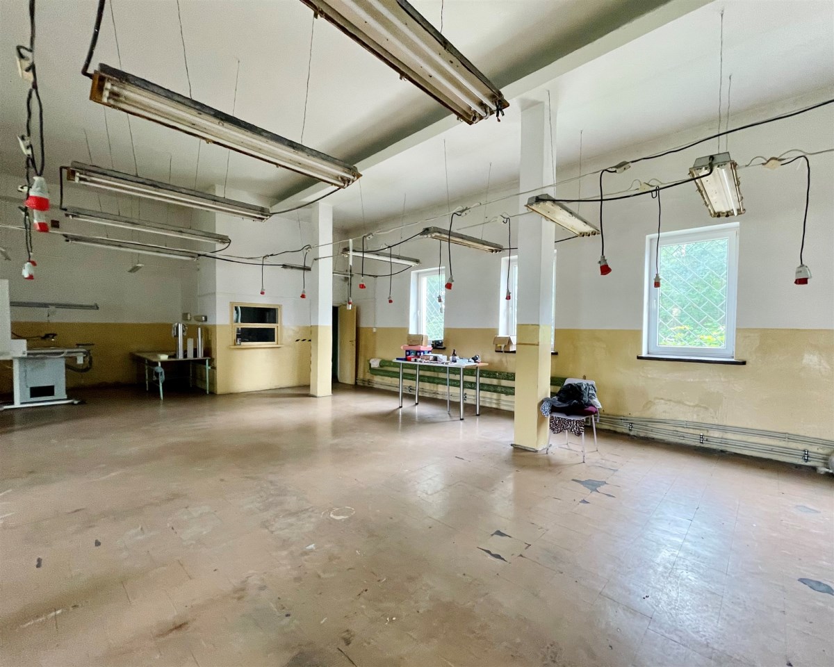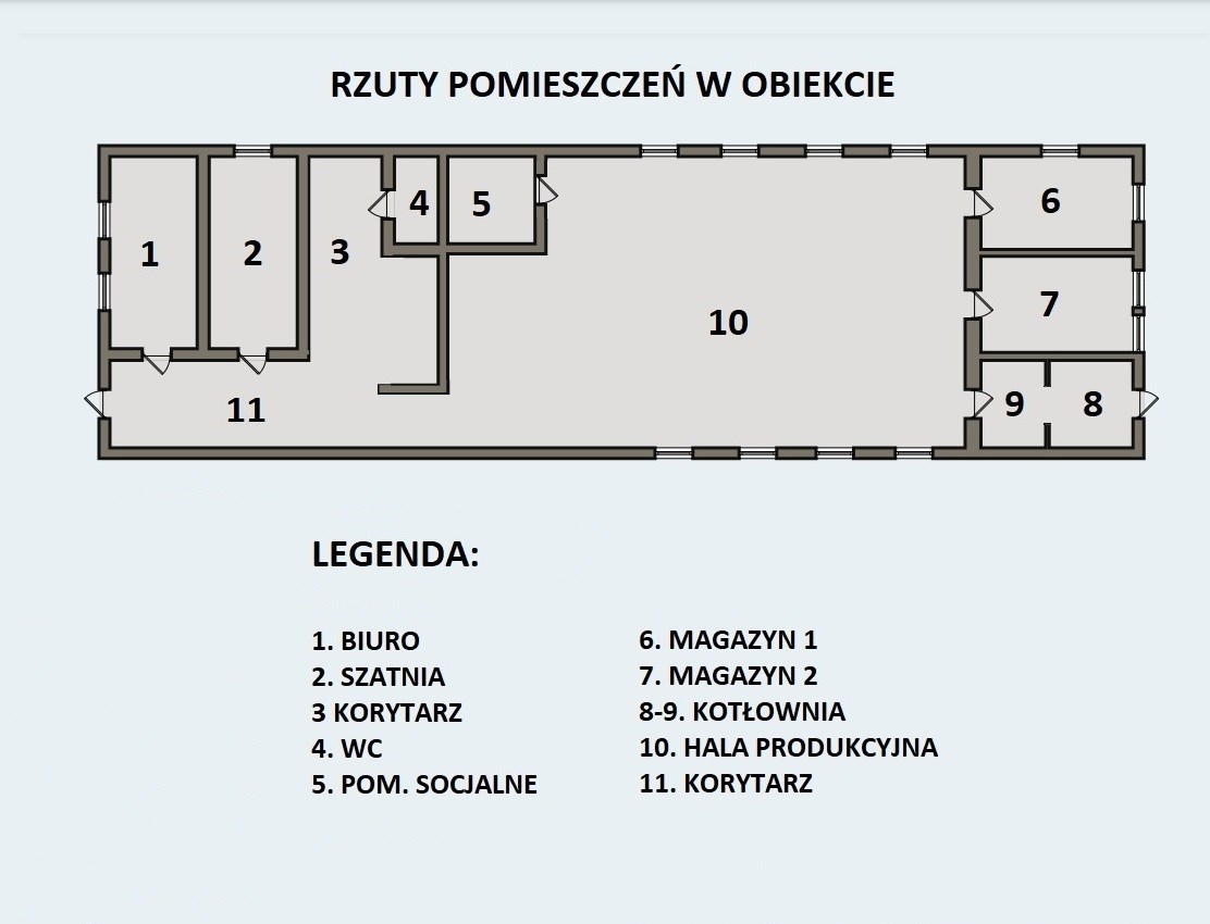 Samodzielny budynek o powierzchni 297m2, z wymiarami 10x35, daje możliwość różnorodnego wykorzystania przestrzeni. W obiekcie wcześniej funkcjonował zakład krawiecki, obecnie dobrze doświetlona hala, posiadająca dostęp do prądu na każdym stanowisku czeka na adaptację pod działalność produkcyjną, handlowo-usługową, biuro, sklep czy hurtownię. W przedmiotowym obiekcie oprócz hali znajduje się wiele innych pomieszczeń: biuro, szatnia, dwa pomieszczenia magazynowe, wc, pom socjalne, kotłownia, korytarz.
